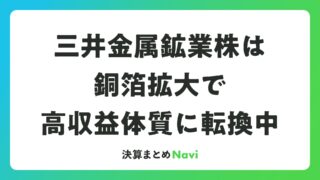 三井金属鉱業株は銅箔拡大で高収益体質に転換中 非鉄金属大手である三井金属鉱業株は、2026年に入り株価が過去最高圏を更新し、投資家から熱い視線を集めています。特に銅箔事業の拡大とAI需要の追い風が業績を後押ししており、長期保有に適した魅力的な銘柄として評価されています。この記事では、株... 決算書: 2026.03.29 決算書