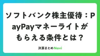 ソフトバンク株主優待:PayPayマネーライトがもらえる条件とは? ソフトバンク(9434)は、通信大手として知られる企業で、株主優待制度を導入し、長期保有を奨励する取り組みを進めています。この優待はPayPayマネーライト1,000円分がもらえるもので、株式投資家にとって魅力的なポイントとなっています。権... 決算書: 2026.04.11 決算書