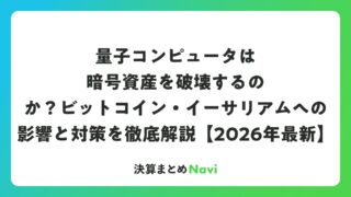 量子コンピュータは暗号資産を破壊するのか?ビットコイン・イーサリアムへの影響と対策を徹底解説【2026年最新】 量子コンピュータの進化が暗号資産の根幹を揺るがしている2026年3月、Googleが発表した論文が暗号資産業界に衝撃を与えた。「十分な性能を持つ量子コンピュータがあれば、ビットコインの秘密鍵をわずか約9分で導出できる」という研究結果だ。さら... 決算書: 2026.04.12 決算書