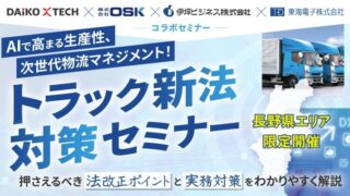 次世代物流マネジメント:AIで高まる生産性、「トラック新法対策」4社コラボセミナー3月3日(火) ニュースの要約 トラック新法への対応と業務効率化を同時に進められる実務対策をテーマとしたセミナーを開催 人手不足解消に向けた運送業界のAI活用事例を紹介 点呼制度の変化と今後の運行管理の方向性を解説概要東海電子株式会社は、DAIKO ... ニュース: 2026.02.10 ニュース