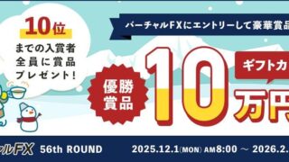 外為どっとコム:仮想資産500万円をFXで増やせるチャンス!第56回『バーチャルFX』コンテストを開催 ニュースの要約 仮想資産500万円をFXで増やせるチャンス「第56回『バーチャルFX』コンテスト」を開催 優勝者にはAmazonギフトカード10万円分が贈られる 10位までの入賞者全員に賞品が進呈される概要株式会社外為どっとコムは、2... ニュース: 2025.12.03 ニュース