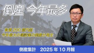 帝国データバンク:10月の倒産、2025年で最多 今年最大の建設業の倒産が発生 年末にかけて緩やかな増加ペースが継続 ニュースの要約2025年10月の企業倒産件数が過去最多ペースで推移建設業では大型倒産が発生し、医療機関の倒産も急増2025年の企業倒産は1万件突破も視野に、緩やかな増加が続く見通し概要株式会社帝国データバンクは、2025年10月の全国企業倒... ニュース: 2025.11.29 ニュース