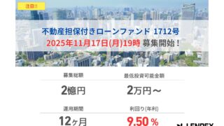 【LENDEX】:本日開始、不動産担保付きローンファンド1712号の募集開始のお知らせ ニュースの要約株式会社LENDEXが11月17日に不動産担保付きローンファンド1712号の募集を開始投資利回りは年利9.50%、運用期間は12ヶ月融資型クラウドファンディングサービス「LENDEX」について紹介概要この度、融資型クラウドファ... ニュース: 2025.11.17 ニュース