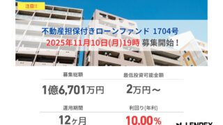 LENDEX:本日開始、不動産担保付きローンファンド1704号の募集開始のお知らせ ニュースの要約 LENDEX(株式会社LENDEX)が、11月10日(月)から「不動産担保付きローンファンド1704号」の募集を開始 年利10.00%の投資利回りを提供し、運用期間は12ヶ月 融資型クラウドファンディングのLENDEX... ニュース: 2025.11.10 ニュース