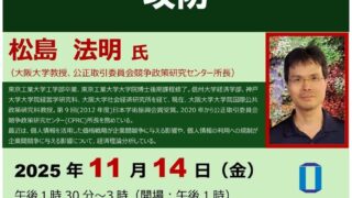 プラットフォーム事業者の攻防:岡山大学経済学会大講演会「プラットフォーム事業者の攻防」〔11/14,金 岡山大学津島キャンパス〕 ニュースの要約 岡山大学経済学会が、プラットフォーム事業者をテーマとした大講演会を開催 講演者は大阪大学教授の松島法明氏で、プラットフォームビジネスをめぐる企業の駆け引きやその影響について解説 講演会は11月14日(金)に岡山大学津島... ニュース: 2025.11.10 ニュース