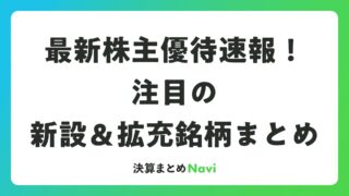 最新株主優待速報!注目の新設&拡充銘柄まとめ 株主優待は、株式投資の大きな魅力の一つです。特に最近の株主優待速報では、新設や拡充の発表が相次いでおり、投資家にとって絶好の機会となっています。この記事では、2026年に入ってからの最新情報を複数ソースから集約し、読者の皆さんが効率的に情報... 決算書: 2026.03.07 決算書
