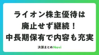 ライオン株主優待は廃止せず継続!中長期保有で内容も充実 ライオン株式会社の株主優待制度は、廃止されることなく継続されており、むしろ中長期保有を奨励する形で一部変更が実施されました。この変更により、100株以上かつ1年以上継続保有する株主様に、新製品を中心とした自社商品の詰め合わせが贈呈される魅力... 決算書: 2026.03.07 決算書
