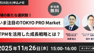 TOKYO PRO Market(TPM):いま注目の”TPM”を活用した成長戦略とは?オンラインセミナー開催のお知らせ ニュースの要約TPM上場経験を有するJ-Adviser、ブリッジコンサルティンググループが2025年11月26日(水)15:00よりオンラインセミナーを開催TPM上場の実態や難易度、成功パターンを知ることができるセミナー上場準備で何から始め... ニュース: 2025.11.10 ニュース