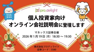 個人投資家向けオンライン会社説明会:【株式会社プロディライト】 個人投資家向けオンライン会社説明会に登壇します(IR note更新) ニュースの要約株式会社プロディライトがオンライン会社説明会を開催IR noteを更新し、ステークホルダーに情報を提供クラウドPBX「INNOVERA」の特徴や活用事例を紹介概要株式会社プロディライトは、個人投資家向けのオンライン会社説明会に... ニュース: 2026.01.06 ニュース
