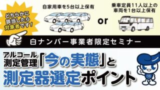 アルコール測定管理:白ナンバー事業者のためのアルコール測定管理ウェビナー無料開催 1月14日(水) ニュースの要約 東海電子株式会社が、白ナンバー事業者を対象とした「アルコール測定管理」についてのウェビナーを無料開催 制度上の要点や現場の実態、測定器の選定ポイントなどについて解説 2026年1月14日(水)13時30分から1時間のオ... ニュース: 2025.12.23 ニュース