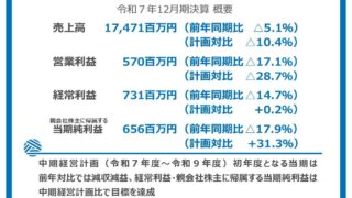株式会社トーア紡コーポレーション:令和7年12月期の決算を発表 ニュースの要約 中期経営計画初年度となる当期の業績は前年比減収減益 経常利益・親会社株主に帰属する当期純利益は中期経営計画比で目標を達成 令和8年12月期の業績見通しを発表概要株式会社トーア紡コーポレーションは、2026年2月13日に... ニュース: 2026.02.15 ニュース