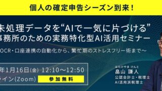 領収書OCR・口座連携の自動化:会計事務所向け 繁忙期対策セミナー – 確定申告業務をAIで効率化する実務ノウハウを40分で解説 ~紙・未処理データの整理まで~ ニュースの要約会計事務所向けの確定申告業務の効率化を目的としたセミナーを開催領収書OCRやAI活用で紙資料処理やデータ整理の自動化を実現繁忙期の業務負担を軽減するためのAI活用策を40分で解説概要株式会社クリーク・アンド・リバー社の会計分野... ニュース: 2025.12.20 ニュース