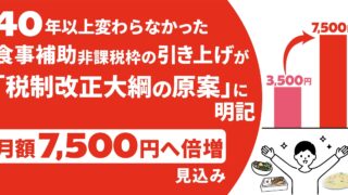 税制改正大綱:与党税調、約40年ぶりの食事補助非課税枠引き上げを「税制改正大綱の原案」に明記!月額7,500円と倍増へ ニュースの要約 与党税調が、食事補助に係る所得税非課税上限を現行の月額3,500円から7,500円に引き上げると発表しました。 これは約40年ぶりの見直しで、企業の福利厚生の選択肢が広がり、従業員の実質手取りアップにもつながると期待され... ニュース: 2025.12.20 ニュース