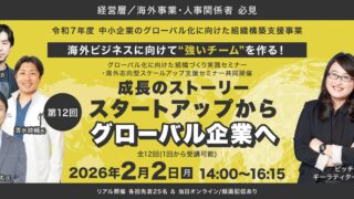 グローバル組織づくり実践セミナー :「成長のストーリー スタートアップからグローバル企業へ」無料セミナー開催 ニュースの要約 東京都中小企業振興公社主催のグローバル組織づくり実践セミナー「成長のストーリー スタートアップからグローバル企業へ」を無料で開催 グローバル人材の育成および海外事業推進に必要な組織づくりをテーマとしたセミナーで、特別講演... ニュース: 2025.12.20 ニュース