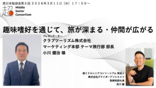 超ミドルシニアコンソーシアム:東日本エリアで第6回勉強会を2026年3月11日(水)に開催 ニュースの要約 超ミドルシニアコンソーシアムが東日本エリアで第6回勉強会を開催 クラブツーリズムの「テーマ旅行」に関するプレゼンテーションを実施 趣味嗜好を通じた旅行と仲間づくりについての議論を行う概要2026年6月6日に発足した「超... ニュース: 2026.02.14 ニュース