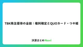 TBK株主優待の全貌:権利確定とQUOカード・つや姫 TBKの株主優待は、長期保有を奨励する形で設計されており、毎年3月末日を権利確定日として実施されています。この制度は、1単元(100株)以上を1年以上継続保有した株主を対象に、保有株数に応じた特典を提供するものです。日常使いやすいアイテムが... コラム: 2026.02.08 コラム
