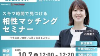 アットセミナー:スキマ時間で自分に合ったFPを見つけられるオンラインセミナーを開催! ニュースの要約 10月7日(火)12時にオンラインセミナー「相性マッチングセミナー」を開催 FPの石飛慶子氏が講師を務め、自分に合ったFPを見つけることができる セミナーは無料で参加可能、先着20名限定概要10月7日(火)12時より、... ニュース: 2025.10.05 ニュース