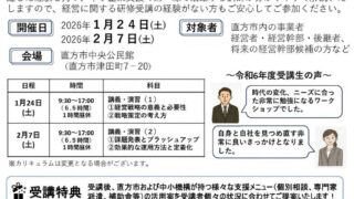 成長戦略策定ワークショップ:【直方市】参加者募集! ニュースの要約 直方市が、市内企業10社程度を対象に「成長戦略策定ワークショップ」を開催 中小企業支援の第一線で活躍する講師が、「経営戦略の意義と必要性」「戦略策定の考え方」などを分かりやすく解説 自社の成長戦略プランの策... ニュース: 2025.11.19 ニュース