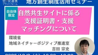 自然共生サイトに係る支援証明書・支援マッチング:環境省担当者登壇!12/2(火)自治体限定オンラインセミナー開催のお知らせ ニュースの要約 環境省が2030年ネイチャーポジティブの実現に向け、自然共生サイトの支援証明書と支援マッチングの制度を開始 自然共生サイトへの支援を希望する企業と、支援を受けたい自治体や地域団体をつなげるマッチングサービスを展開 自治... ニュース: 2025.11.19 ニュース