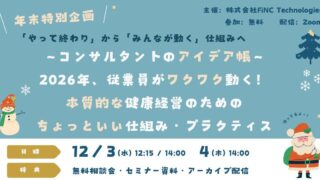 健康経営セミナー:~コンサルタントのアイデア帳~2026年、従業員がワクワク動く!本質的な健康経営のためのちょっといい仕組み・プラクティス 12月3日/4日 開催! ニュースの要約 健康経営の「マンネリ化」や「形骸化」に課題を抱えている企業向けに、従業員が主体的に健康行動を取る仕組み・プラクティスを学べるセミナーを開催 健康経営に悩む企業の担当者を対象に、健康経営コンサルタントが具体的な解決策を提案... ニュース: 2025.11.14 ニュース