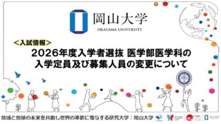 岡山大学:2026年度入学者選抜医学部医学科の入学定員及び募集人員の変更について ニュースの要約 2026年度の岡山大学医学部医学科の入学定員および募集人員が変更される 入学定員の変更に伴い、地域枠や一般選抜など各選抜区分の募集人員も変更される 詳細は岡山大学のホームページで確認できる概要岡山大学は、2026年度の... ニュース: 2025.11.05 ニュース