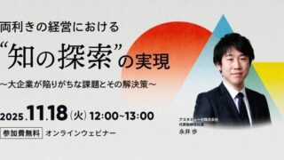 両利きの経営:大企業が陥りがちな課題とその解決策を探る新作ウェビナーを再開催 ニュースの要約 両利きの経営における「知の探索」の実現に関する新作ウェビナーを再開催 大企業が陥りがちな課題とその解決策について具体的に紹介 過去の動画のアーカイブ配信となるが、参加者にはスライド資料のダウンロードも可能概要アスタミュ... ニュース: 2025.11.04 ニュース