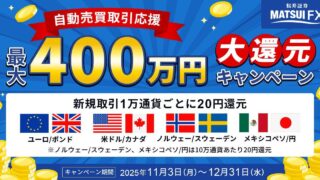 FX取引:最大400万円のキャッシュバック!自動売買応援キャンペーンを開催 ニュースの要約 松井証券がFX取引で最大400万円のキャッシュバックキャンペーンを開催 対象は4つの通貨ペアで、新規取引に応じてキャッシュバック FX自動売買の設定方法を解説する動画も公開概要松井証券は2025年11月3日から12月3... ニュース: 2025.11.03 ニュース