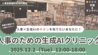 【人事のための生成AIクリニック:】生成AIを使いこなし「戦略人事」への第一歩!基礎からワークで学ぶ『人事のための生成AIクリニック~基礎編~』12月2日(火)人事図書館にて開催|東京 人形町 ニュースの要約株式会社Trustyyleが運営する人事図書館で、「人事のための生成AIクリニック~基礎編~」を開催生成AIを活用して「戦略人事」を実現するための基礎を、実践的なワークを通して学べるプログラム初めてAIに触れる人から、すでに一... ニュース: 2025.10.25 ニュース