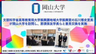 岡山大学:文部科学省高等教育局大学振興課地域大学振興室の石川雅史室長が岡山大学を訪問し、那須保友学長らと意見交換を実施 ニュースの要約 文部科学省高等教育局大学振興課地域大学振興室の石川雅史室長が岡山大学を訪問し、那須保友学長らと意見交換を実施 意見交換では、高等教育機関や地方公共団体、地域の協議体との連携による地域のアクセス確保や地方創生の取り組みを推... ニュース: 2025.10.19 ニュース