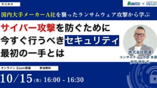 マモリノジダイ:国内大手メーカーA社を襲ったランサム攻撃 。サイバー攻撃を防ぐために今すぐ行うべきセキュリティ最初の一手とは | 関通×マモリノジダイ 共催セミナー ニュースの要約 国内大手メーカーA社がランサム攻撃を受けたことが明らかに 株式会社関通の経験から得た教訓を共有するセミナーの開催が発表 サイバー攻撃への備えが企業にとって喫緊の課題であることが示唆概要2025年10月15日(水)16:... ニュース: 2025.10.09 ニュース