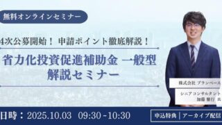 省力化投資補助金 一般型:第4回公募WEBセミナー、採択率アップの申請ノウハウを徹底解説 ニュースの要約 第4回公募「省力化投資補助金 一般型」に関するWebセミナーを開催 過去の採択実績から申請成功のポイントを解説 採択されやすい設備の組み合わせや申請スケジュールなどを紹介概要株式会社プランベースは、2025年10月3日... ニュース: 2025.09.29 ニュース