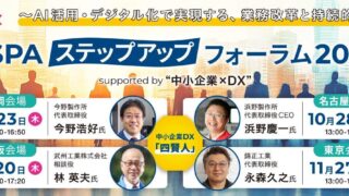 CSPA ステップアップフォーラム 2025:福岡・名古屋・大阪・東京の4地域で開催――中堅・中小企業が”半日で掴む経営の打ち手” ニュースの要約一般社団法人クラウドサービス推進機構(CSPA)と「中小企業×DX(BCN)」が、中堅・中小企業向けに「CSPA ステップアップフォーラム 2025」を開催本フォーラムは福岡・名古屋・大阪・東京の4地域で開催され、「AI活用・... ニュース: 2025.09.29 ニュース