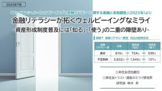 金融リテラシー:ウェルビーイング向上の重要なカギとなる~資産形成制度普及には「知る」・「使う」の二重の障壁あり!~ ニュースの要約 全国1万人を対象に金融リテラシー度を測定した結果、7.1%が「良好」、59.4%が「順調」、約3割が「不足気味」となった。 金融リテラシー度が「良好」な人は「不足気味」な人よりも約3倍、資産形成に取り組んでいる。 金融... ニュース: 2025.07.22 ニュース