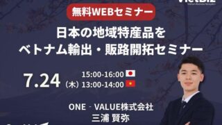 日本の地域特産品をベトナム輸出・販路開拓セミナー:【無料セミナー】日本の地域特産品をベトナム輸出・販路開拓セミナー ニュースの要約 経済成長著しいベトナム市場において、日本の地域特産品がどのように評価され、どのような商品が現地で支持を得ているかを解説する ベトナムで売れる商品・売れない商品の特徴や、有望な小売チャネル、販路開拓の戦略やプロモーション方... ニュース: 2025.07.22 ニュース