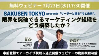 SAKUSEN TOKYO:限界を突破できるマーケティング組織をどう構築したか?───無料ウェビナーシリーズ「リーダーと語る”今と未来”」開催決定 ニュースの要約株式会社SAKUSEN TOKYOが「限界を突破できるマーケティング組織をどう構築したか?」をテーマにしたウェビナーを開催ゲストスピーカーに株式会社タネトシカケ代表取締役の高口裕之氏を迎え、マーケティング組織の進化と人材育成・... ニュース: 2025.07.21 ニュース