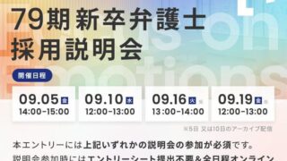 Authense法律事務所:2025.9.5/9.10/9.16/9.19 Authense法律事務所79期 新卒弁護士 採用説明会開催のお知らせ ニュースの要約 Authense法律事務所は、2025年9月5日、9月10日、9月16日、9月19日に新卒弁護士の採用説明会を開催する オンラインで開催される説明会では、事務所の弁護士が働き方やキャリア形成、研修制度について説明する ... ニュース: 2025.07.21 ニュース