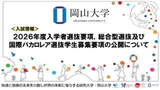 岡山大学:2026年度入学者選抜要項、総合型選抜及び国際バカロレア選抜学生募集要項の公開について ニュースの要約岡山大学が2026年度入学者選抜要項、総合型選抜及び国際バカロレア選抜学生募集要項を公開したこと総合型選抜及び国際バカロレア選抜の学生募集要項が公開されたこと2026年度の入学者選抜要項の詳細が公開されたこと概要国立大学法人岡... ニュース: 2025.07.06 ニュース