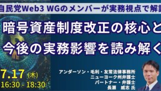 「JPIセミナー」:「暗号資産制度改正の核心と今後の実務影響を読み解く」7月17日(木)開催 ニュースの要約 2025年3月、暗号資産交換業者に対する資産の国内保有命令の創設が発表されました。 電子決済手段・暗号資産サービス仲介業の創設など、暗号資産関連の制度改正が検討されています。 自民党Web3 WGと金融庁が暗号資産の制... ニュース: 2025.07.05 ニュース