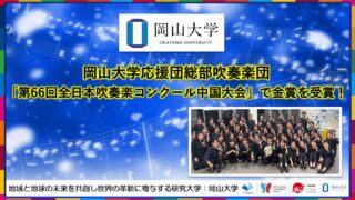 岡山大学応援団総部吹奏楽団:【岡山大学】岡山大学応援団総部吹奏楽団が「第66回全日本吹奏楽コンクール中国大会」で金賞を受賞! ニュースの要約 岡山大学応援団総部吹奏楽団が「第66回全日本吹奏楽コンクール中国大会」で金賞を受賞した。 昨年度の銀賞から更なるパワーアップを遂げた。 今後の活動として、オータムコンサート、中四国国立大学合同演奏会・美術展覧会、定期演... ニュース: 2025.09.15 ニュース
