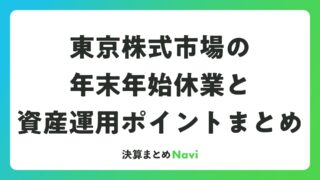 東京株式市場の年末年始休業と資産運用ポイントまとめ 東京株式市場は、年末年始の期間に取引が休止し、投資家にとって重要なスケジュール調整のタイミングとなります。この記事では、2025年から2026年にかけての具体的な休業日程、取引再開の詳細、証券会社の対応、そしてこの時期を活かした資産運用のポ... 決算書: 2026.02.27 決算書