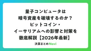 量子コンピュータは暗号資産を破壊するのか?ビットコイン・イーサリアムへの影響と対策を徹底解説【2026年最新】 量子コンピュータの進化が暗号資産の根幹を揺るがしている2026年3月、Googleが発表した論文が暗号資産業界に衝撃を与えた。「十分な性能を持つ量子コンピュータがあれば、ビットコインの秘密鍵をわずか約9分で導出できる」という研究結果だ。さら... 決算書: 2026.04.12 決算書