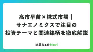 高市早苗×株式市場|サナエノミクスで注目の投資テーマと関連銘柄を徹底解説 日本の政治と株式市場は切っても切れない関係にあります。とりわけ、第104代内閣総理大臣として女性初の首相に指名された高市早苗氏の誕生は、日本株にとって非常に大きなインパクトをもたらしました。自民党総裁選で勝利した直後から日経平均株価は大きく... 決算書: 2026.04.18 決算書