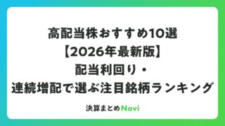 高配当株おすすめ10選【2026年最新版】配当利回り・連続増配で選ぶ注目銘柄ランキング ※本記事は一般的な情報提供を目的としており、金融アドバイスではありません。投資は元本割れのリスクを伴い、最終的な投資判断はご自身の責任で行ってください。個別の投資判断については金融アドバイザーにご相談ください。【2026年版】高配当株おすす... 決算書: 2026.04.15 決算書