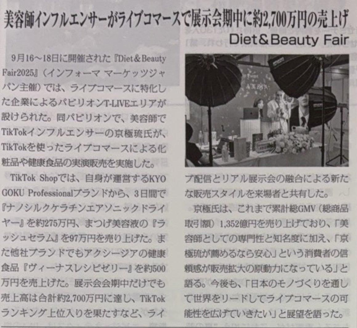 美容師でありTikTokインフルエンサーとして活動する京極琉は、2025年9月16日~18日に東京ビッグサイトにて開催された「Diet & Beauty Fair 2025」におけるライブコマースの実績が、業界専門紙『健康産業新聞』に掲載されました。