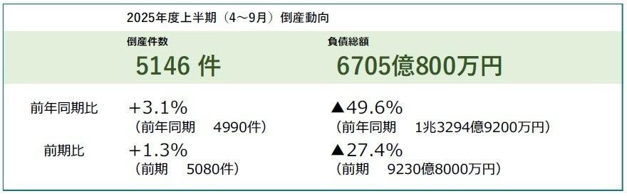 2025年度上半期の倒産件数は5146件で、前年同期比3.1%増加し、上半期としては12年ぶりに5000件を上回りました。また、8半期連続の増加となっています。一方で、負債総額は6705億800万円と、前年同期比49.6%減少し、上半期としては4年ぶりに1兆円を下回りました。