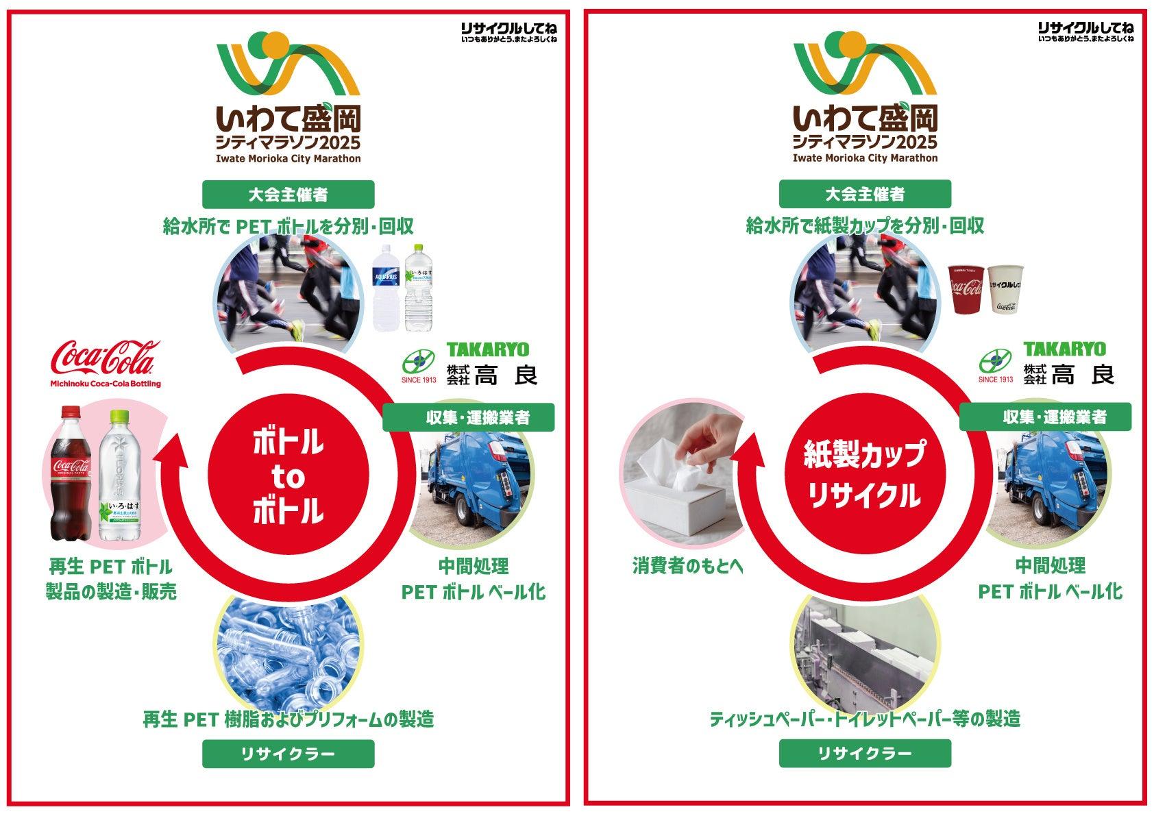みちのくコカ・コーラボトリング株式会社は、オフィシャルドリンクパートナーを務める「いわて盛岡シティマラソン2025」において、前回大会(2025年)に引き続き、いわて盛岡シティマラソン実行委員会および株式会社高良と協働し、PETボトルの水平リサイクル「ボトルtoボトル」と「紙製カップリサイクル」の取り組みを実施します。