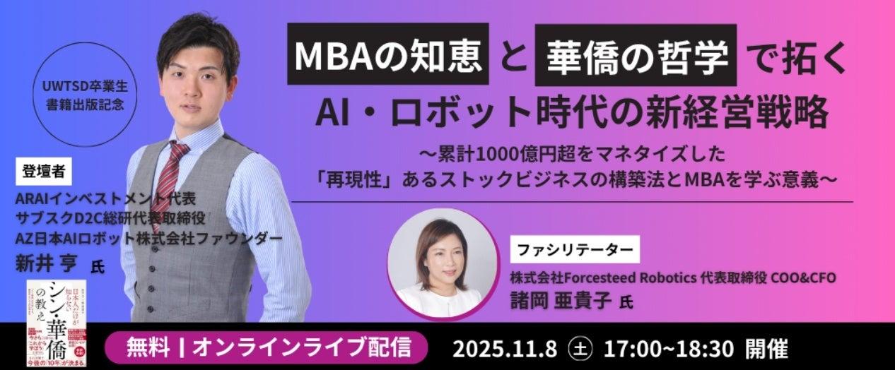 さらに、新井亨が実践するAIロボットを活用したストック型ビジネスの構築法や、AI時代のMBAの意義についても解説します。MBA出身者だけでなく、ビジネスに関心のある方なら誰でも参加可能な内容となっています。