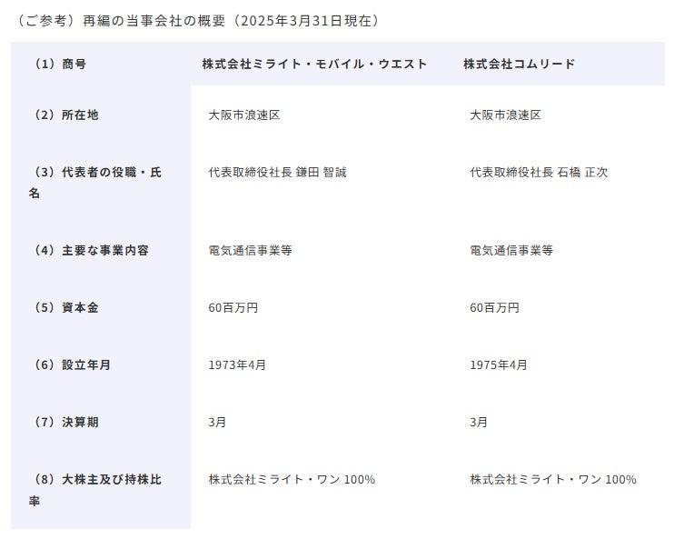 統合の概要は、グループ内のモバイル事業及びNW事業を担う子会社2社(株式会社ミライト・モバイル・ウエスト、株式会社コムリード)の統合で、2026年7月を目途に行われる予定となっています。