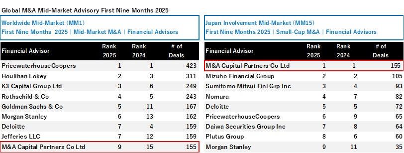 - M&Aキャピタルパートナーズが、2025年1月~9月の中規模・小規模市場M&Aリーグテーブルワールドワイドで、上半期に続きトップ10入りを果たした。