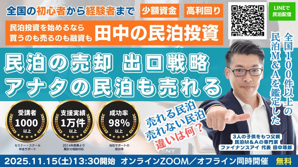 株式会社ファイナンスアイは、2025年11月15日(土)に「民泊運営者必見!物件なしでもありでも売却できる!民泊事業の出口はM&A売却!」と題したオンライン・リアル同時開催セミナーを開催します。